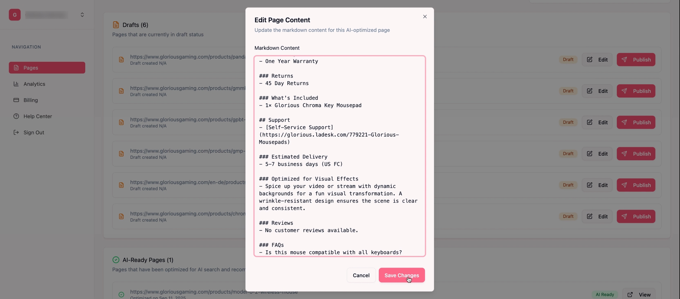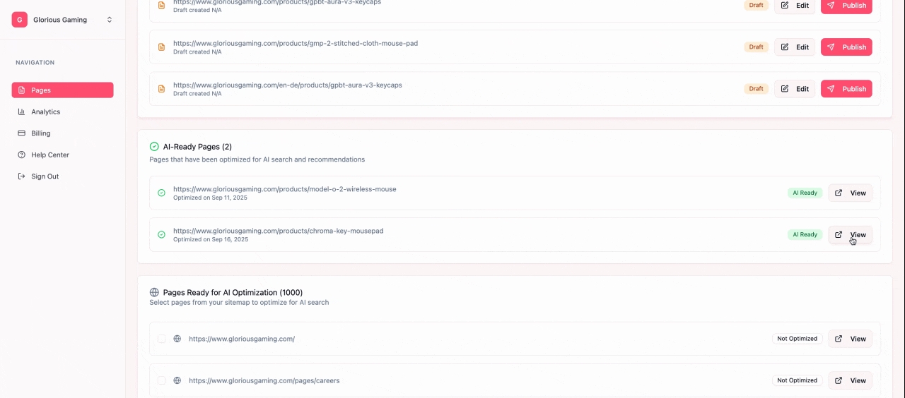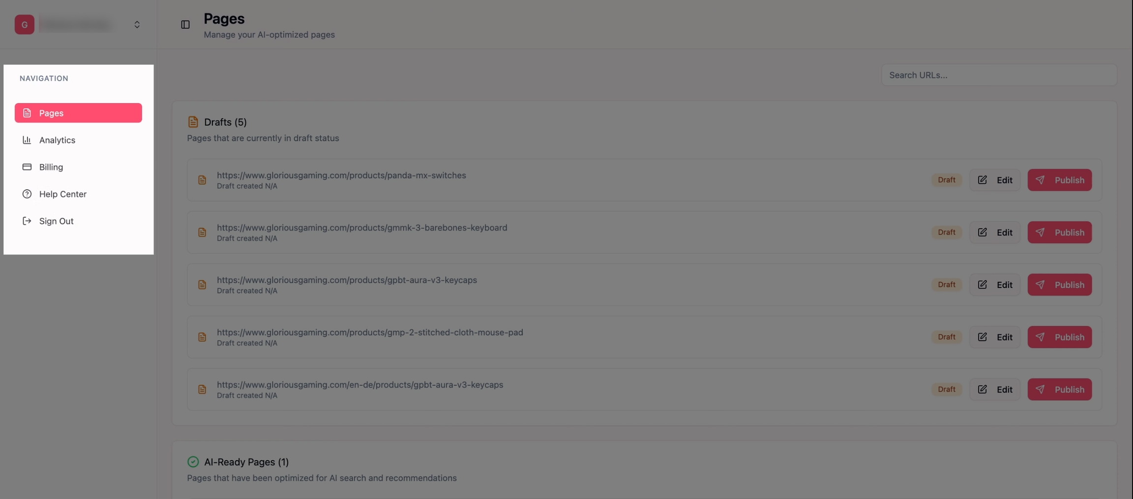 The more pages you translate and publish, the better your site will perform in AI search engines like ChatGPT, Perplexity, and Claude. Every optimized page increases your chances of being recommended in answers, product searches, and brand queries.